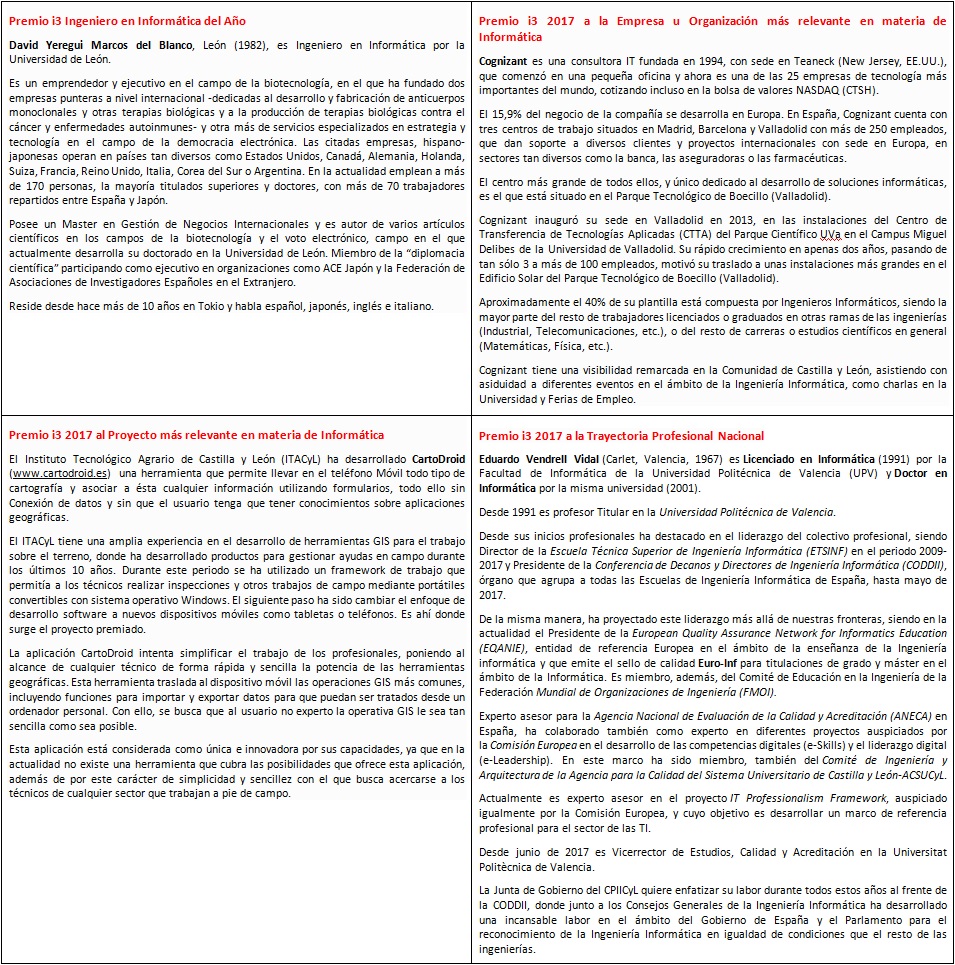 Como ya es tradición, en el marco de esta gala se hizo entrega de los Premios i3 (i cubo), en los que se reconoce el esfuerzo y trabajo de todos aquellos actores relacionados estrechamente con la Ingeniería Informática en el ámbito de la Comunidad de Castilla y León.