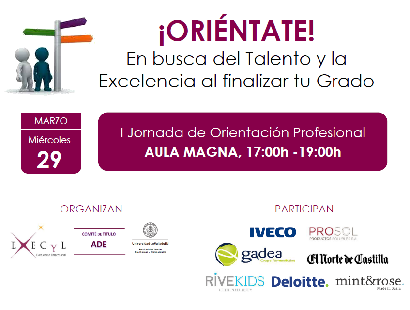 Si desde EXECyL estamos preocupados por la Excelencia y el desarrollo del Talento en Castilla y León, tenemos la obligación de estar cerca de los profesionales del futuro. Por esta razón, dentro del Programa «FUTURO Y EXCELENCIA» formamos parte del Comité de Título de ADE de la Facultad de Económicas de la Universidad de Valladolid en calidad de profesionales externos (nos permite acercar dos mundos que deberían estar más unidos: Empresa y Universidad) y hemos co-organizado su I Jornada de Orientación Profesional: