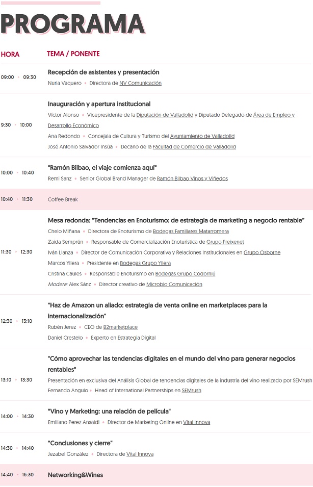 Hemos seleccionado a excelentes profesionales relacionados con el marketing, la comunicación y el mundo del vino para que intervengan como ponentes. De su dilatada experiencia, podremos obtener valiosas ideas para transformarlas en negocios tangibles.