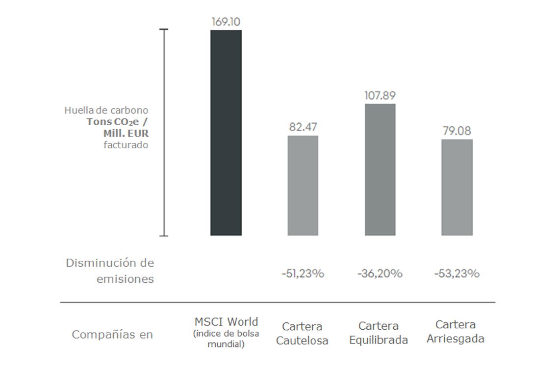 Por apoyarnos en un ejemplo, quizá el parámetro de análisis más extendido es el de la huella de carbono cuya medición nos sirve como muestra, y en cuya disminución pueden ustedes influir directamente con sus propias inversiones. Vean, así, la reducción que alcanzamos en la emisión de toneladas de CO2 por cada millón de euros facturado, en las carteras de fondos de inversión de Tressis, excluyendo a las empresas más contaminantes y favoreciendo a aquellas con mejores prácticas medioambientales: