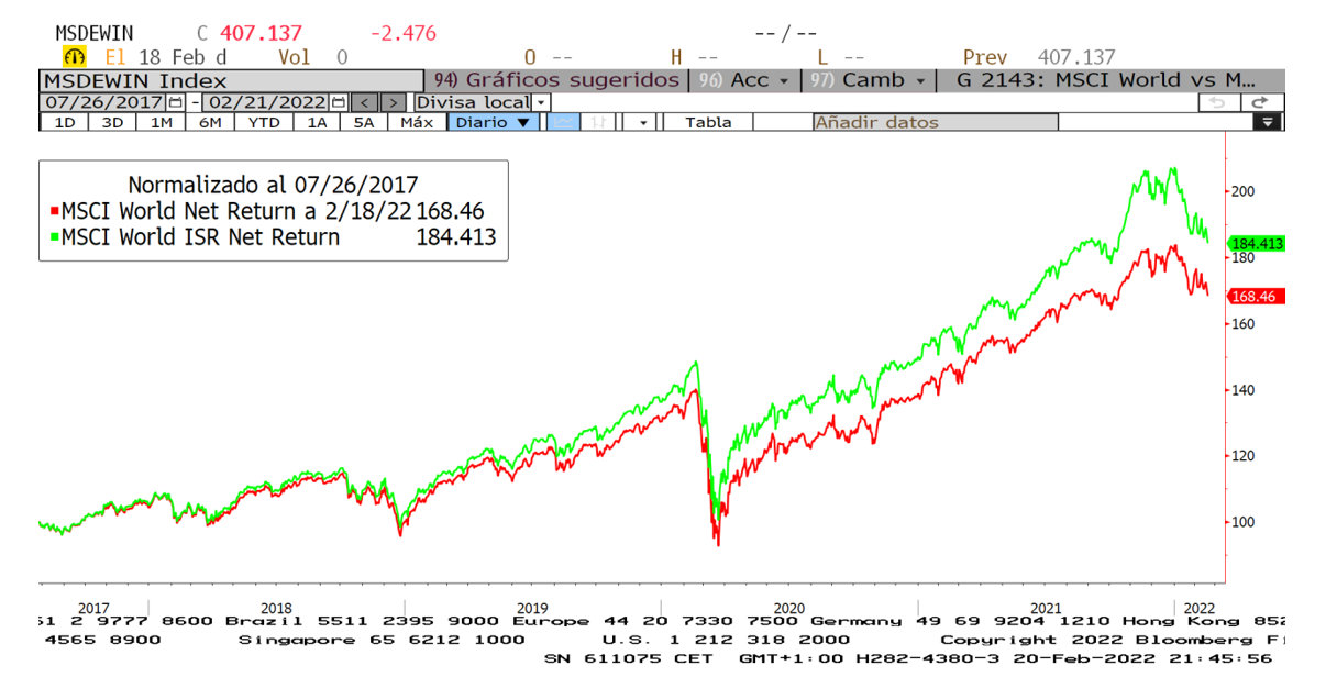 Pongamos como muestra los siguientes fondos ISR de renta variable global, frente al índice de bolsa mundial convencional: