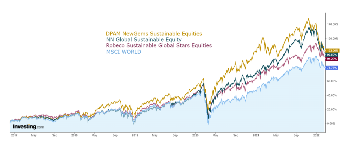 De hecho, observen como el índice de bolsa global sostenible bate holgadamente al convencional desde que comenzó a cotizar en julio de 2017, con un 16% más de rentabilidad de las compañías sostenibles (línea verde) en estos casi cinco años: