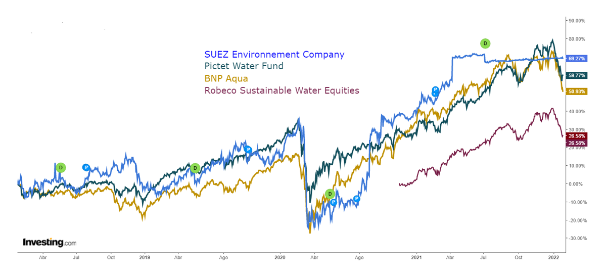 Pues bien, Aquona está participada por Suez, grupo industrial francés especializado en la gestión y tratamiento de aguas, un recurso escaso que recientemente comenzó a cotizar como materia prima en el mercado de futuros americano, y en torno al que tienen lugar muchas oportunidades de inversión ligadas a la optimización de su explotación, como muestra la propia evolución en bolsa de la compañía francesa, o de algunos fondos enfocados en esta temática:
