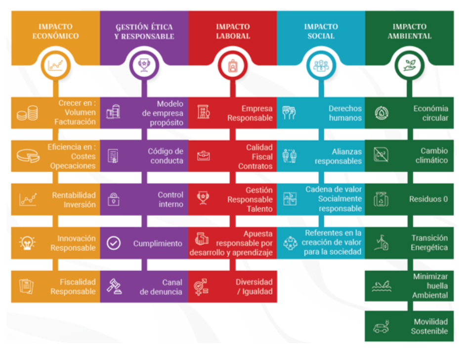Es por esta razón que articulamos todo nuestro negocio en torno a nuestro Plan Director de Negocio Responsable que construimos en torno a cinco ejes: la Gestión ética y responsable, el Impacto Económico, el Social, el Laboral y el Ambiental.